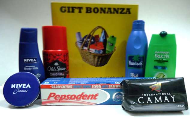 An Assortment of 7 popular FMCG items from the monthly list of a housewife. Put together in an attractive and robust gift box with full branding. Offered as a sales incentive for dealers on purchase of “X” amount of lubricant oil cases.