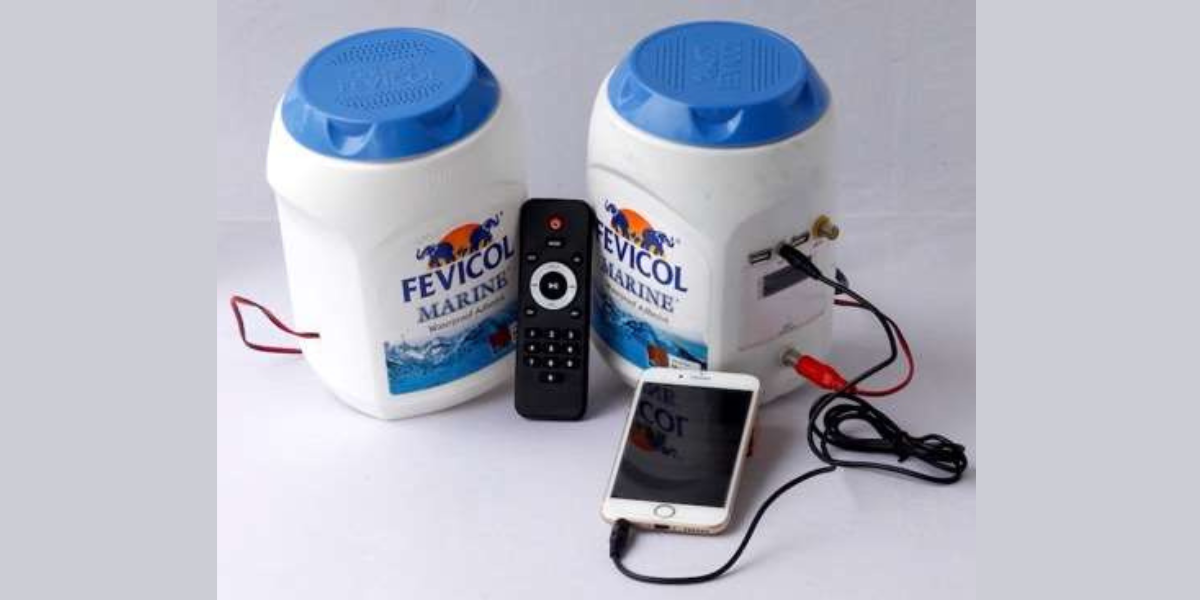 Custom made STEREO Blue Tooth Speakers* with FM Radio, AUX Input & USB Input with Remote Control fitted in original Fevicol Marine 5 kgs packs. Using the original pack ensures that there is no compromise on the form factor and branding.