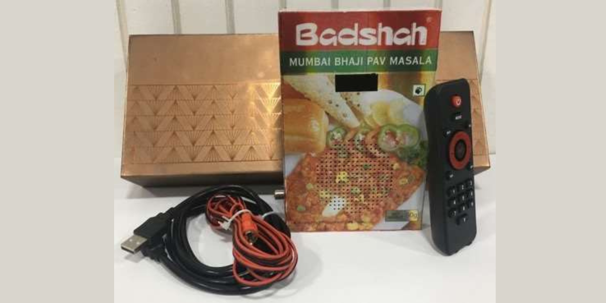 Custom made Blue Tooth Speaker* with FM Radio, AUX Input & USB Input with Remote Control and 6 Hour rechargeable battery fitted in a specially developed case matching the form factor of a Badshah Masala pack.